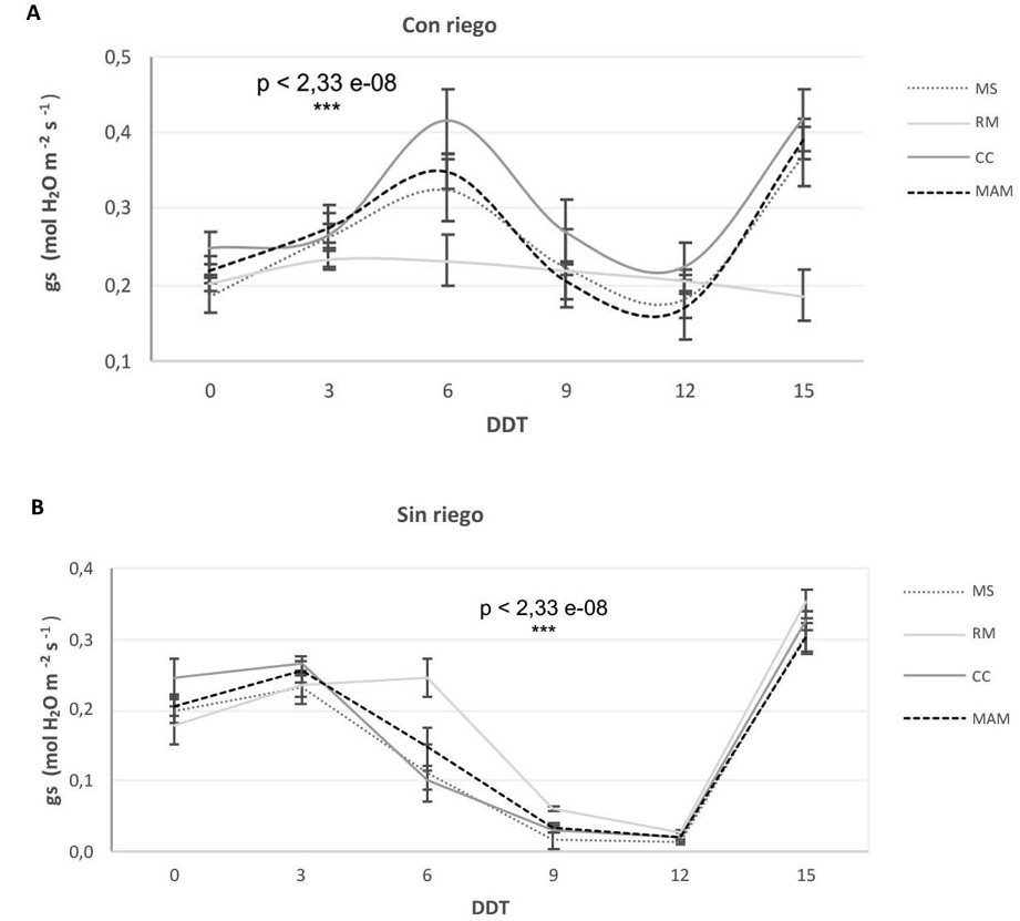 La conductancia estomática (gs) presentó comportamiento diferencial entre las plantas con y sin riego y entre los cultivares en plantas, se evidenció, a modo general, como en plantas con riego el comportamiento varió según el momento de evaluación y, relacionado con las condiciones ambientales, como la temperatura, en plantas sin riego hizo que se presentara un descenso gradual de la gs a medida que aumentaba la severidad del déficit hídrico.
