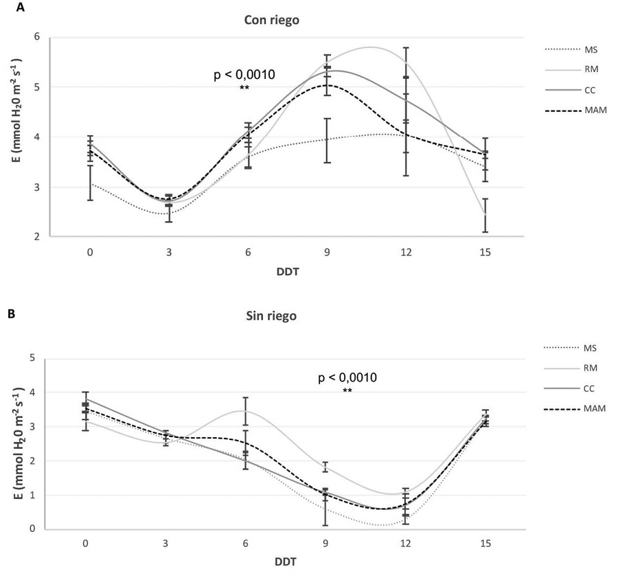 En cuanto a la tasa de transpiración (E), el comportamiento fue similar a la gs, donde en plantas con riego la respuesta varió según el cultivar y las condiciones ambientales presentes en el momento de la evaluación. En cuanto a las plantas sin riego, se presentó un descenso gradual de la E a medida que descendió la humedad del suelo.