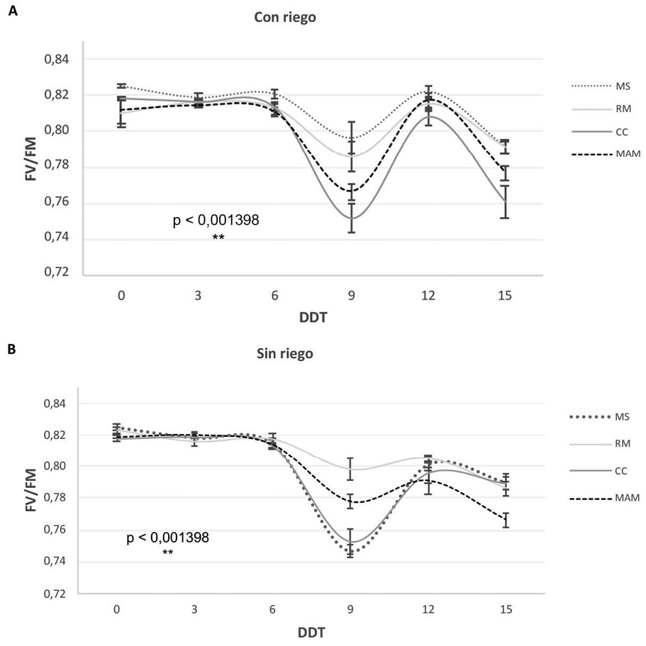 La eficiencia fotosintética (Fv/Fm) más alta se presentó al inicio del estudio para Morasurco, tanto en plantas con y sin riego con 0,825 Fv/Fm, seguidos de Ratona Morada en plantas sin riego con 0,823 Fv/Fm. Los menores valores se presentaron el día 9 (DDT) para Morasurco sin riego con 0,746 Fv/Fm, seguidos de Criolla Colombia en plantas con y sin riego con 0,752 y 0,753 Fv/Fm, respectivamente (Figura 6). Además, se evidencia como en el día 12 (DDT) de evaluación en plantas sin riego se evidencian menores valores respecto al control.
