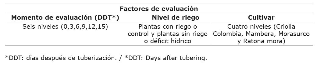 Los tres factores de evaluación se distribuyeron de la siguiente manera: la parcela hace referencia a seis momentos de evaluación en días después de tuberización (DDT), los cuales corresponden al avance en la intensidad del estrés dado por el agotamiento progresivo de la humedad del suelo y las condiciones climáticas presentes en cada evaluación; la subparcela obedece al nivel de riego, el cual se dividió en plantas control y plantas con déficit hídrico; y la sub-subparcela fueron los cultivares. Se establecieron cuatro repeticiones por tratamiento en evaluación, con 32 sub-sub parcelas, las cuales se conformaron por 18 plantas (Cuadro 1).