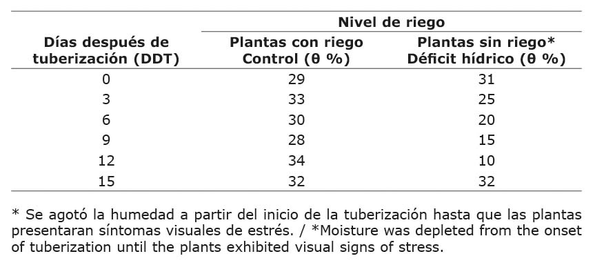 Se definió agotar la humedad volumétrica (θ), a partir del inicio de la tuberización hasta que las plantas presentaran síntomas visuales de estrés intenso (pérdida alta de turgencia en las hojas, decaimiento de las plantas, cierre estomático), esto ocurrió al alcanzar un 10 % de humedad volumétrica del suelo, después de doce días de agotamiento de humedad. Las evaluaciones se realizaron cada tres días, transcurrido este tiempo se efectuó un riego de recuperación para evaluar a los quince días si se presentaban daños en el fotosistema (Cuadro 2).