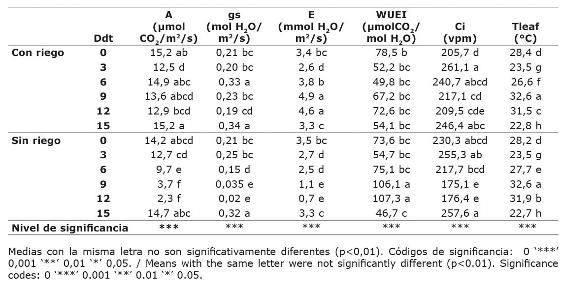 Se evidenció una disminución progresiva para A, gs y E a medida que aumentó el déficit hídrico. Se conformaron tres grupos en el comportamiento respecto a los momentos de evaluación, entre los 0 y 3 DDT, al día 6 DDT y entre los días 9 y 12 DDT, con diferencias estadísticas entre ellos. Además, se evidenció que en las plantas con riego en los días de alta temperatura (32,6 y 31,5 °C), los valores de intercambio gaseoso fluctuaron respecto a los momentos con temperaturas más bajas (Cuadro 3).