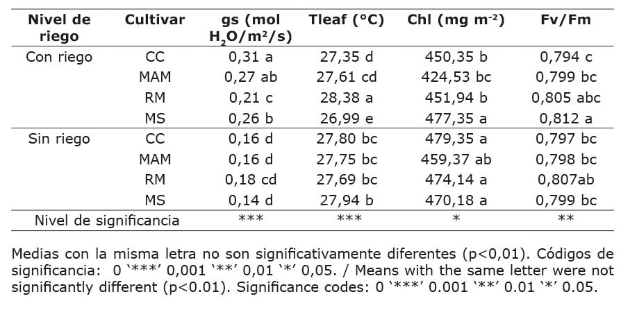 En la interacción entre los tres factores de evaluación (nivel de riego*momento* cultivar), se presentaron diferencias significativas en la temperatura de la hoja (Tleaf) con Pr(>F) 2,87e-05, la conductancia estomática (gs) con Pr(>F) 2,33e-08, la transpiración (E) con Pr(>F) 0,0010 y la eficiencia fotosintética Fv/Fm con Pr(>F) 0,001398.
