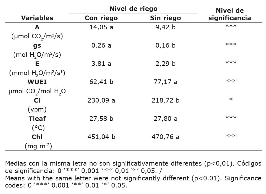 Para el nivel de riego en el comportamiento de la Chl se obtuvo Pr (>F) 0,0000969, los mayores valores se presentaron para las plantas expuestas a déficit hídrico con 470,76 mg m-2. En cuanto a la Tleaf con Pr (>F) 0,0000166, fue mayor para las plantas sin riego con 27,80 °C. Ci con Pr (>F) 0,015551 mostró los valores más altos en plantas control 230,09 vpm, y para el WUEI con Pr (>F) 0,000104 fue para plantas sin riego con 77,17 µmol CO2/mol H2O. Variables como la A, gs y E con Pr (>F) < 2e-16, los valores más altos siempre fueron para plantas con riego (Cuadro 5).