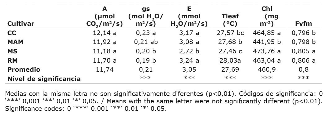 Para el efecto simple del cultivar, se evidenció como la A (Pr(>F) 0,08704) no presentó diferencias entre los cultivares con un promedio de 11,74 µmol CO2 m-2 s-1. En cuanto a la gs (Pr(>F) 0,000192), los mayores valores fueron para Criolla Colombia con 0,23 mol H2O m-2 s-1. Las variables E (Pr(>F) 1,27e-07), Tleaf (Pr(>F) 3,28e-15) y Fv/Fm (Pr(>F) 2,88e-05), mostraron los valores más altos en Ratona Morada, con 3,24 mmol H2O m-2 s-1, 28,03 °C y 0,806 Fv/Fm. Por último, la concentración de Chl (Pr(>F) 9,68e-05) más alta fue para Morasurco con 473,76 mg m-2 (Cuadro 6).