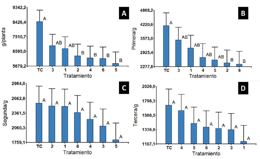 Figure 1. Weight per plant between treatments obtained by applying biopélets of M. pruriens in tomato (S. lycopersicum) indeterminate var. Dioniso®. A) Weight/plant in grams per treatment. B, C and D) Weight of first, second and third quality in g/plant. January-June, 2022. Tablón del Guarco, Cartago, Costa Rica.