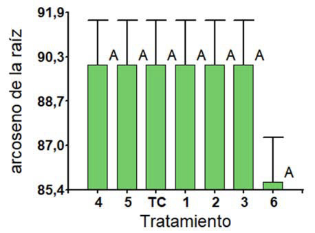Figure 2. Arcsine of the square root of the percentage of survival of tomato (S. lycopersicum) indeterminate var. Dioniso® to F. oxysporum at the end of the experiment (different letters denote significant differences p<0.05). January-june, 2022. Tablón del Guarco, Cartago, Costa Rica.
