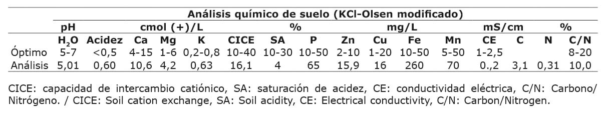 Se delimitó un área experimental de 12 x 12 m (144 m2) en el que se trasplantó tomate de la variedad indeterminada Dioniso® a una distancia de 1,2 m entre hilera y 0,4 m entre plantas para una densidad de 20,825 plantas ha-1. Se realizó un análisis inicial de suelo de tipo químico completo, con la finalidad de determinar las cantidades de macronutrientes y micronutrientes, % de Carbono (C), % de Nitrógeno (N), C/N y % de M.O (materia orgánica) (Cuadro 1).