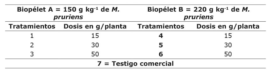 Se evaluaron dos formulaciones del biopélet, una llamada biofertilizante A con 150 g kg-1 de M. pruriens y otro denominado biofertilizante B con 220 g kg-1 de M. pruriens (Cuadro 2). Se aplicó a la base de las plantas, en dosis de: 15, 30 y 50 g por planta (270, 540 y 900 kg ha-1). Dichas dosis constituyeron los tratamientos, cada tratamiento tuvo siete repeticiones distribuidas al azar en toda el área experimental. Se incluyo un testigo comercial, el cual constaba del manejo comercial recomendado para el cultivo de tomate según López Marín (2017).