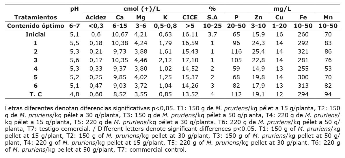 Al comparar los niveles de nutrimentos y otros parámetros en el suelo en un estado inicial versus final se encontró que, en los tratamientos aplicados con biopélet el pH, acidez y % saturación de acidez (S.A) mantuvieron niveles menores al testigo comercial, lo cual se considera benéfico al evitar la degradación del suelo por acidificación (Cuadro 4). Los elementos Ca, Mg, K, Zn (excepto en el tratamiento 6) terminaron con niveles más altos en los tratamientos con respecto al testigo comercial (Cuadro 4). La CICE terminó con un mejor valor en los tratamientos con respecto al testigo comercial (Cuadro 4).