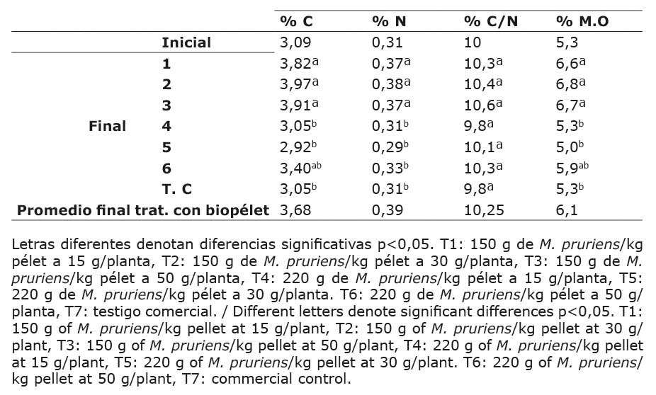 En cuanto a los niveles de C, N y M.O en el suelo, se observaron diferencias significativas entre tratamientos (p<0,05) (Cuadro 5). Los tratamientos 1, 2 y 3, superaron al testigo comercial en cuanto a C, N y M.O. En la relación C/N no hubo diferencias significativas (p>0,05). Otro aspecto a considerar es que el promedio final de C, N, C/N y M.O fue mayor al finalizar el experimento (p>0,05), por lo cual se registra un aumento en dichas variables en comparación a los valores iniciales.