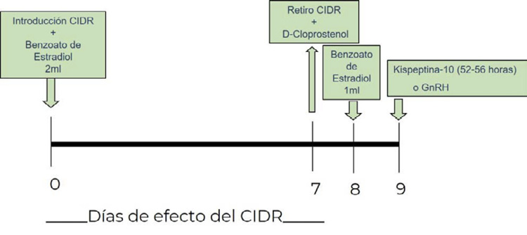 Figure 1. Ovulation synchronization protocol in cows (B. taurus x B. indicus) with an intravaginal device (CIDR) and intramuscular injections of estradiol benzoate, D-cloprostrenol, Kisspeptin-10 and gonadotropin-releasing hormone (GnRH). National Institute for Forestry, Agricultural and Livestock Research, Puebla, Mexico. 2020-2021.