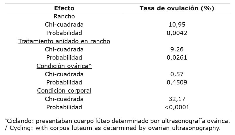 Se observó un efecto (p<0,05) de rancho, tratamiento anidado en rancho y condición corporal, pero no hubo efecto de la condición ovárica (p>0,05), según los valores de Chi-cuadrada y probabilidad de los efectos incluidos en el modelo estadístico para analizar la tasa de ovulación (Cuadro 1).