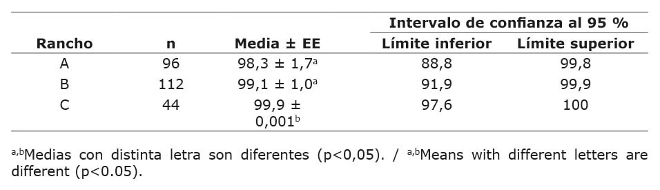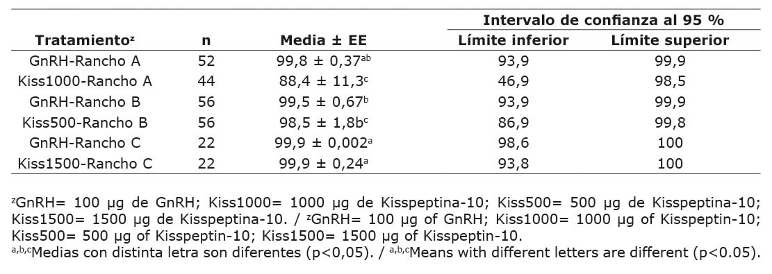 Para la tasa de ovulación por rancho, las medias de cuadrados mínimos y sus errores estándar se muestran en el Cuadro 2. Los ranchos A y B tuvieron menor (p<0,05) tasa de ovulación que el rancho C y no hubo diferencia (p>0,05) entre los ranchos A y B. Respecto a la tasa de ovulación por tratamiento anidado en rancho, los tratamientos GnRH-Rancho A, GnRH-Rancho B y Kiss1500-Rancho C produjeron mayores (p<0,05) tasas de ovulación que los tratamientos Kiss1000-Rancho A y Kiss500-Rancho B. Entre los tratamientos Kiss1000-Rancho A y Kiss500-Rancho B, la tasa de ovulación no fue diferente (p>0,05). En el Cuadro 3 se muestran las tasas de ovulación por tratamiento anidado en rancho. No se observó un efecto significativo (p>0,05) de la condición ovárica (ciclando o no ciclado) al iniciar el tratamiento. Las medias de cuadrados mínimos y sus errores estándar e intervalos de confianza al 95 % para la tasa de ovulación se muestran en el Cuadro 4. La tasa de ovulación promedio fue 99,6 %.