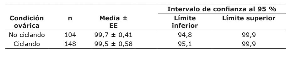 Table 4. Least-square means and their standard errors (EE) and 95 % confidence intervals for ovulation rate (%), by ovarian condition, in beef cows (B. taurus x B. indicus) under subtropical conditions. National Institute for Forestry, Agricultural and Livestock Research, Puebla, Mexico. 2020-2021.