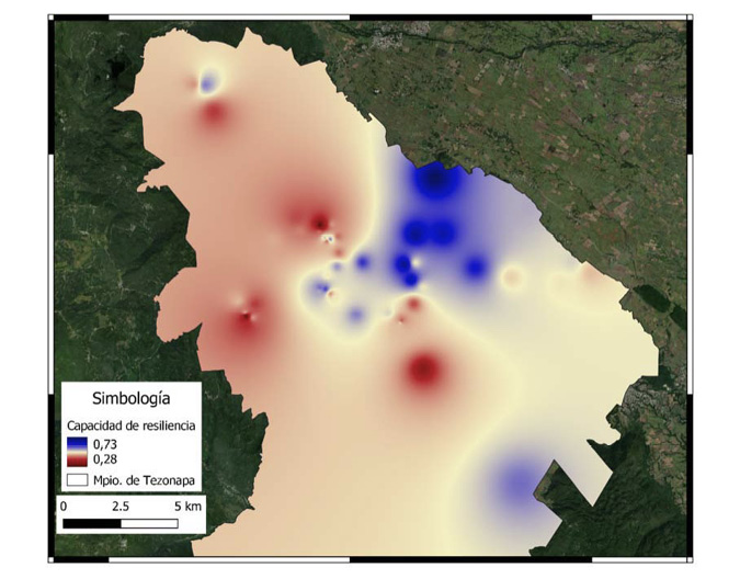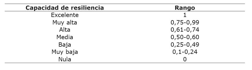 El índice de capacidad de resiliencia se estableció en una escala de 0–1 (Cutter et al., 2010); para ello, se integraron por treinta indicadores. Estos factores fueron normalizados por el método de escalamiento mínimo-máximo (Cutter et al., 2010). Las variables donde los valores fueron más altos correspondieron a bajos niveles de resiliencia, el valor de las variables fue invertido. Los valores cercanos a 1 indican alta capacidad de resiliencia y los valores cercanos a 0 representan nula o baja capacidad de resiliencia (Cutter et al., 2010).