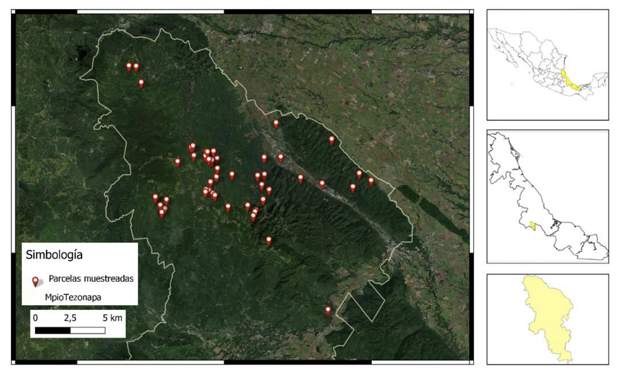 Esta investigación se realizó de diciembre de 2017 a noviembre de 2018 en el municipio de Tezonapa, estado de Veracruz, México (Figura 1), en parcelas cafetaleras distribuidas en zonas de valle y de montaña ubicados en un gradiente altitudinal entre los 100 y 1400 m s. n. m. El tipo de suelo en el municipio corresponde a vertisol para la zona de valle y litosol para la de montaña (Instituto Nacional de Estadística y Geografía [INEGI], s.f.a). El tipo de clima es cálido húmedo en el valle y semicálido húmedo en la montaña (INEGI, s.f.b).