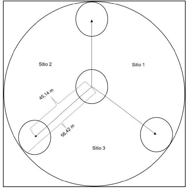 Cada conglomerado estuvo constituido por cuatro sitios o subunidades circulares de 400 m2 (radio de 11,283 m) con un punto central en el sitio de muestreo. La distribución de estos sitios corresponde a una “Y” invertida con respecto al norte (N), en la que el sitio 1 representa el centro del conglomerado y los sitios 2, 3 y 4 las unidades de muestreo periféricas. Los sitios 2, 3 y 4 se encuentran a 0°, 120° y 240° de azimut, respectivamente, equidistantes a 45,14 m del centro del conglomerado (Comisión Nacional Forestal [CONAFOR], 2010) (Figura 2). Se tomaron datos de pendiente con un clinómetro digital. Se hicieron observaciones sobre la estructura vegetal de cada parcela y sobre la presencia o ausencia de: erosión laminar o de cárcavas (FAO, 2009), y asocio del cafetal con otros cultivos (García Alaniz et al., 2016).