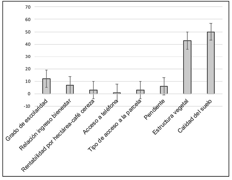 Entre las variables en escala ordinal que tuvieron mayor frecuencia positiva (Figura 3) y que aportaron a la CRAC, sobresalieron los correspondientes a la dimensión ambiental, entre ellos la estructura vegetal, por la presencia de una asociación entre cafetos con herbáceas-arbustos-árboles, esto como resultado de la necesidad de sombra de los cafetos. La calidad del suelo, respecto a otras variables, presentó diferencias significativas (X2=86,316 P<0,005), debido a que los parámetros del suelo, en promedio, presentaron valores altos, el nitrógeno total alto (0,255 ±0,033), fósforo asimilable alto (11,604 ±31,020), materia orgánica alta (9,929 ±16,773) pH moderadamente ácido (6,289 ±0,621), conductividad eléctrica muy ligeramente salina (0,128), capacidad de intercambio catiónico alta (25,144 ±9,882), hierro intercambiable adecuado (36,840 ±17,485), cobre adecuado (0,804 ±0,817), zinc adecuado (11,447±588,954) y manganeso adecuado (24,17±18,755). El 83 % de las parcelas contaba con una estructura del estrato arbóreo, arbustivo y herbáceo asociado con los cafetos. EL 11 % presentó la asociación cafetos-herbáceas, el 4 % solo cafeto y cafetos-árboles 2 %.
