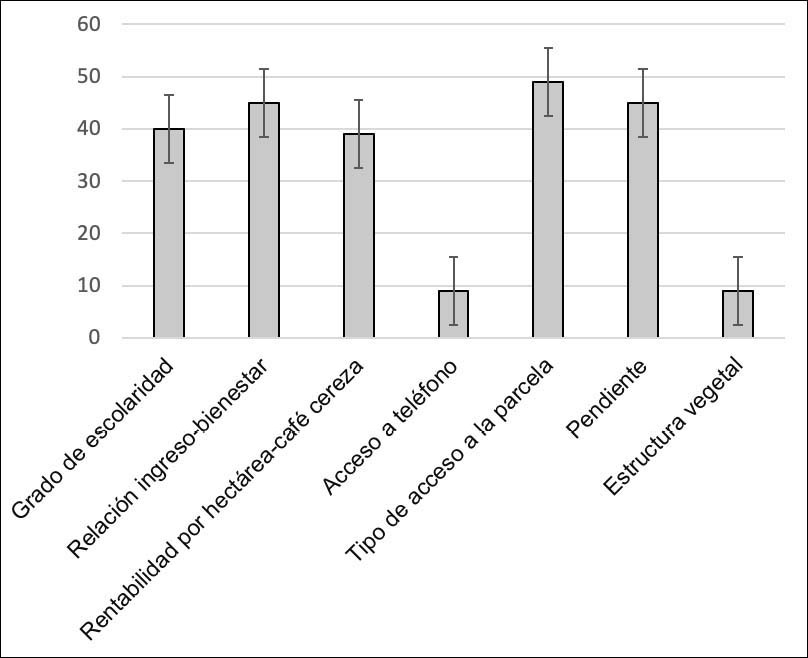 Los resultados obtenidos mostraron que la ubicación remota de los cafetales limita el acceso a los recursos institucionales y complica la venta de la producción de café (Pérez, 2021). Para el caso de las variables acceso a la parcela y pendiente del terreno, el resultado obtenido se debe a que las parcelas muestreadas se encontraban en una zona rural y montañosa, en donde lo accidentado del relieve dificulta dar mantenimiento a la infraestructura de acceso, por lo que es frecuente encontrar pequeñas veredas en donde solo puede transitar un arriero y el animal de carga. En los cafetales cercanos a centros económicos se facilita el acceso a los recursos institucionales y su ubicación se asocia a terrenos planos, lo que representa una ventaja para innovar y adaptarse a escenarios de crisis (Hausermann, 2014; Leyva Mir, 2010).