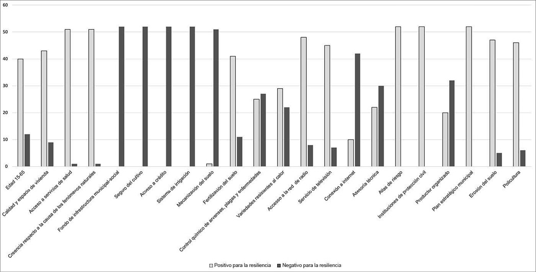 Figure 5. Frequency variables with positive and negative dichotomous responses for the resilience capacity of 52 coffee (C. arabica) farms in Tezonapa, Mexico. 2018.