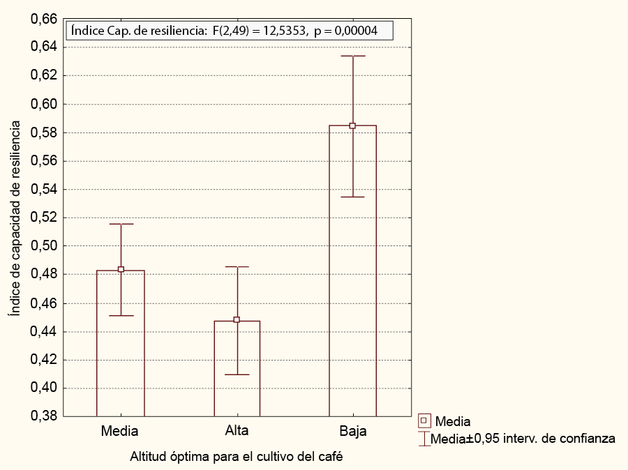 De las 52 fincas, veintiocho (53 %) presentaron una capacidad de resiliencia baja, dieciocho (34 %) capacidad media y seis (11 %) capacidad alta. Se encontró una tendencia de las fincas con CRAC alta a encontrarse a una altitud menor y a medida que aumentaba la altitud de donde se encontraban las fincas de la CRAC fue menor. Es probable que la altitud y lo abrupto del relieve montañoso limiten el acceso de los productores a servicios públicos y productivos diversos. Se encontraron diferencias significativas entre los valores medios del índice de CRAC (prueba de F P<0,05), distribuidos según la clasificación de altitud óptima para el cultivo de café (World Coffee Research, s.f.), donde existen tres categorías: altitud baja, media y alta. Las fincas ubicadas a una altitud baja presentaron mayor CRAC con diferencias significativas respecto a la CRAC de fincas localizadas a una altitud media y alta (Figura 6).