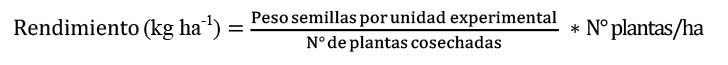 Al final del ciclo del cultivo se determinó el rendimiento agrícola en cada unidad experimental y tratamiento, para el efecto se estimó mediante la ecuación 2 propuesta por Cantaro-Segura et al. (2019).