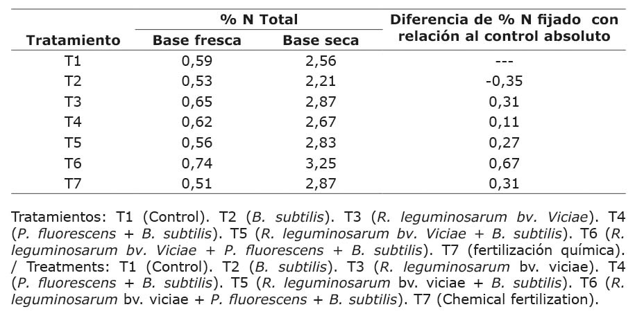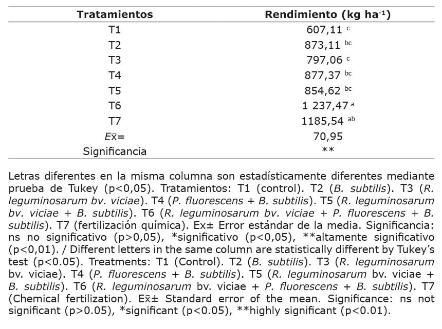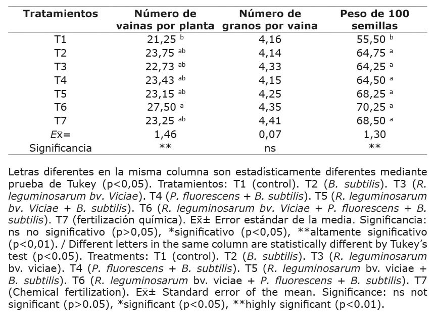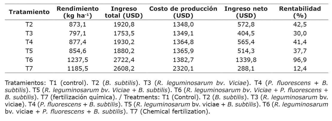 Diversos estudios realizados para evaluar el aumento en rendimiento promovido por los microorganismos benéficos, cuando se evaluó la acción de biofertilizantes, hubo un incremento positivo en el rendimiento agrícola con la inoculación de las especies de Rhizobium en comparación con el control (Colás-Sánchez et al., 2018), lo que sugiere que las PGPR pueden ser usadas como estimulantes del rendimiento agrícola bajo condiciones similares a las del estudio y sobre todo en una agricultura sostenible. Cuando se evaluó el efecto en campo de la cepa nativa COL6 de R. leguminosarum bv. viciae se obtuvieron resultados similares a la investigación, el rendimiento estimado fue significativamente mayor con respecto a los demás tratamientos y similar a la fertilización química, al aplicar el inoculante bacteriano obtuvieron 1,77 t ha-1 (Granda-Mora et al., 2017).