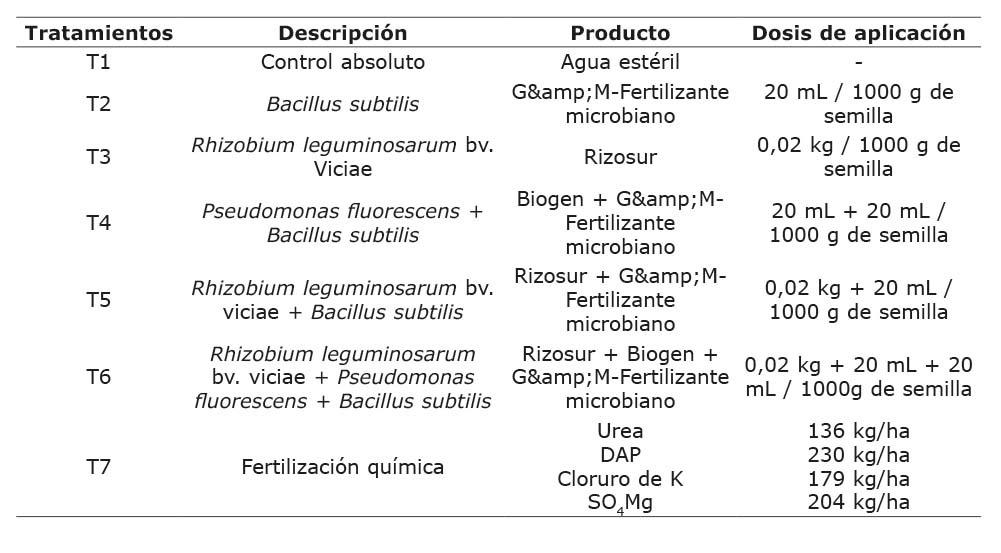 Se emplearon semillas de fríjol común del cultivar Mantequilla de hábito de crecimiento arbustivo determinado tipo I, procedente del Instituto Nacional de Investigaciones Agropecuarias (INIAP) de Ecuador. Se utilizó un diseño en bloques completos al azar (DBCA) con 28 unidades experimentales, siete tratamientos con cuatro repeticiones. Se tuvo un tratamiento testigo sin fertilización (T1), como tratamientos experimentales, se utilizaron los microorganismos R. leguminosarum bv. viciae (Rizosur), Bacillus subtilis (G& M-Fertilizante microbiano) y P. fluorescens (Biogen), de acuerdo con las dosis detalladas en el Cuadro 1. El tratamiento con fertilización química (T7) se definió según el contenido previo de nutrientes en el suelo (Cuadro 2). La fertilización química se aplicó de manera edáfica y fraccionada en la etapa fenológica V3 y R5.