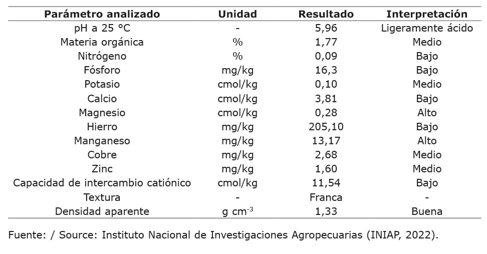 Table 2. Chemical analysis of the soil at the experimental site. La Argelia Experimental Station, Loja, Ecuador. 2022.
