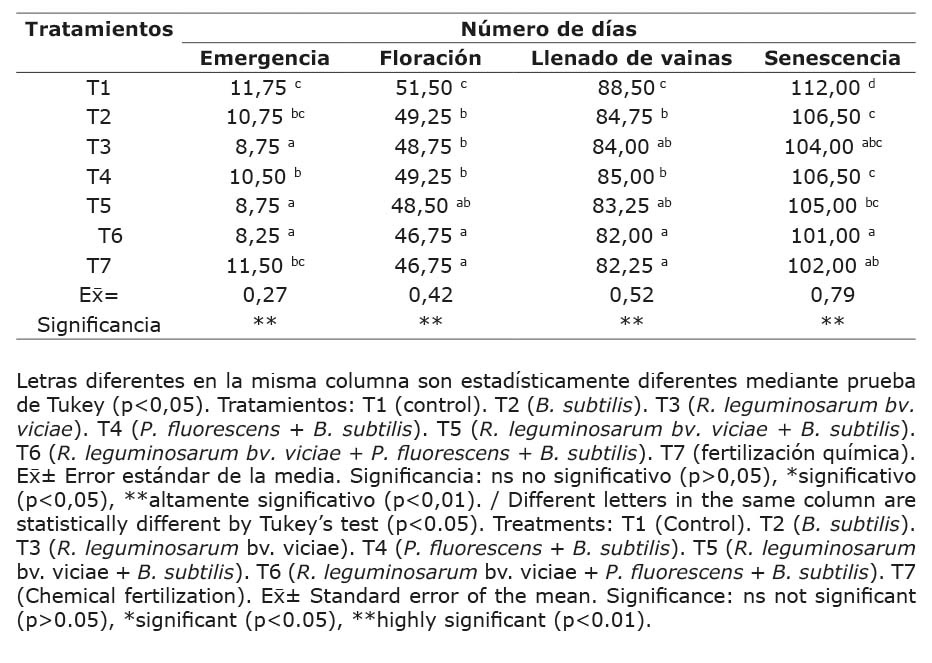 La inoculación con los microorganismos benéficos en fríjol común var. Mantequilla presentó un efecto significativo (p<0,05) en las variables fenológicas evaluadas (Cuadro 3). El número de días a la emergencia disminuyeron donde se inocularon R. leguminosarum bv. viciae (T3); R. leguminosarum bv. viciae + B. subtilis (T5) y R. leguminosarum bv. viciae + P. fluorescens + B. subtilis (T6). Mientras que, los días a floración, llenado de vainas y senescencia tuvieron un efecto significativo donde se inoculó R. leguminosarum bv. viciae + P. fluorescens + B. subtilis (T6) y fertilización química (T7), en todos los casos el control absoluto (testigo) demostró mayor tiempo (días) hasta la floración.