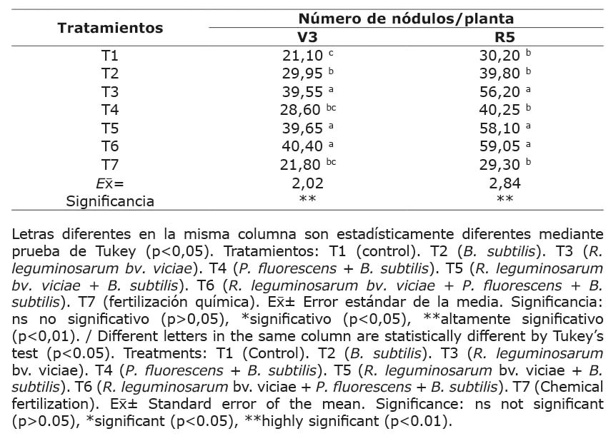 La presencia de nódulos fue positiva en las plantas de fríjol evaluadas en las etapas fenológicas V3 y R5 (Cuadro 4). Se evidenciaron diferencias significativas (p<0,05) para el número de nódulos donde se aplicaron R. leguminosarum bv. viciae (T3); R. leguminosarum bv. viciae + B. subtilis (T5) y R. leguminosarum bv. viciae + P. fluorescens + B. subtilis (T6) con respecto a los tratamientos 1, 2 y 4. Se obtuvieron como promedio 45 nódulos en las raíces de cada planta inoculada, con una coloración rojiza en su interior donde se aplicó las cepas de Rhizobium.