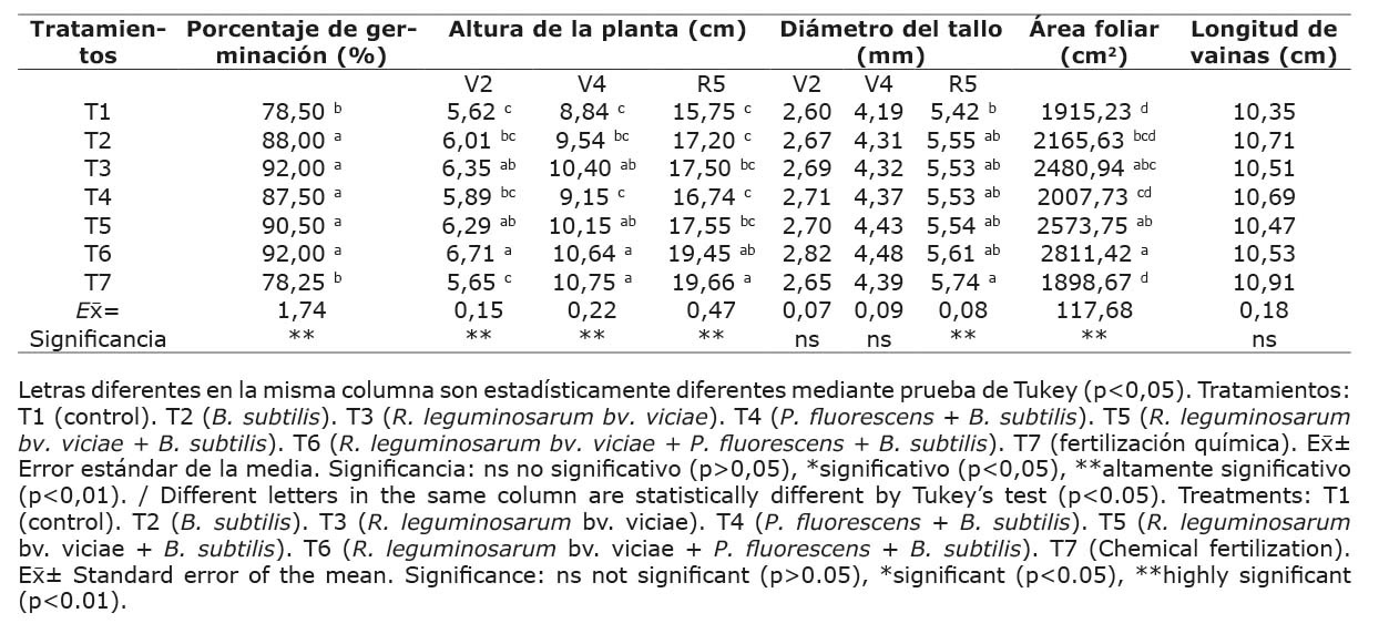 El porcentaje de germinación de las semillas de fríjol var. Mantequilla y la emergencia de las plantas resultó significativa (p<0,05) con la inoculación de microorganismos benéficos (Cuadro 5). A los 30 y 45 días de la aplicación de R. leguminosarum bv. viciae + P. fluorescens + B. subtilis (T6) y la fertilización química, favorecieron el crecimiento de las plantas, en ambos casos las mismas presentaron mayor altura. El diámetro del tallo no mostró diferencias significativas (p>0,05) entre los tratamientos etapa V2 y V4, sin embargo, en la etapa R5 la fertilización química influyó en mayor diámetro de las plantas, pero no mostró diferencias significativas (p>0,05) con la aplicación de los microorganismos benéficos, donde el tratamiento control absoluto el que presentó el menor diámetro del tallo. El tratamiento que estimuló un mayor desarrollo del área foliar en las plantas de fríjol fueron las plantas tratadas a base de R. leguminosarum bv. viciae + P. fluorescens + B. subtilis. En todos los casos el T6 ejerció una significativa diferencia (p<0,05) con el tratamiento fertilización química y el control. Mientras que, en la variable longitud de vainas no se evidenció diferencias significativas (p>0,05) en ninguno de los tratamientos aplicados.