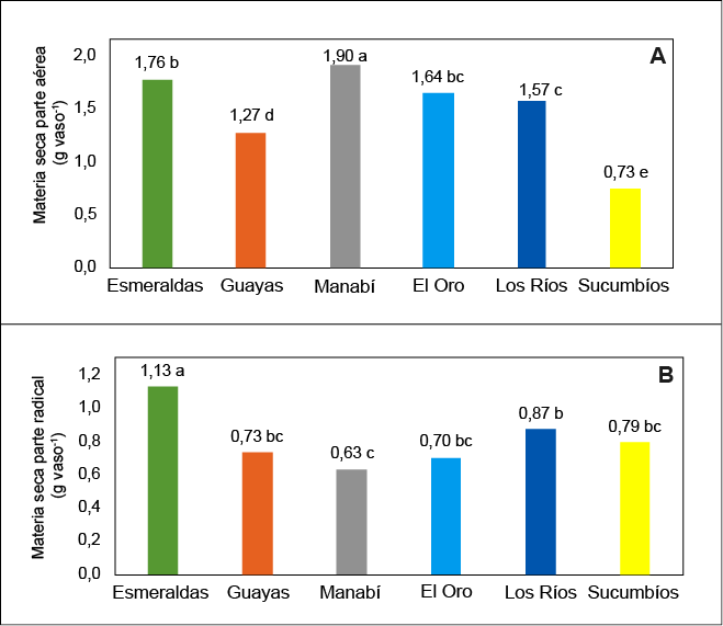 La menor producción de materia seca fue observada en los suelos de Sucumbíos como se muestra en la Figura 1A, que corresponde a un suelo ácido, con pH 4. En el resto de los suelos evaluados la producción de materia seca no fue afectada a excepción de los suelos de Guayas, con valores de pH por encima de 7,9, donde el valor de materia seca fue de 1,27 g vaso-1, que fueron significativamente inferiores (P<0,05) a los observados en el resto de los tratamientos. Contrario a lo observado en la producción de la parte aérea, en las raíces se presentó un menor desarrollo radical en los suelos del Guayas, Manabí y El Oro (Figura 1B) con valores de 0,73, 0,62 y 0,69 g vaso-1, respectivamente, mientras que en los suelos ácidos con pH de 4 como los reportados en Sucumbíos el valor de materia seca en la parte radical fue de 0,79 g vaso-1.