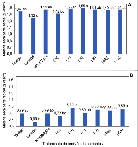 Además del tipo de suelo, la producción de materia seca aérea (MSA) de las plántulas de arroz fue afectada por el nutriente que fue omitido, como se observa en la Figura 2A; así, el valor más bajo de materia seca se obtuvo en el testigo contaminado con Cd y cuando fue excluido el nitrógeno con un valor de 1,32 y 1,42 g vaso-1, respectivamente, aunque son estadísticamente iguales (P<0,05); mientras que los mayores valores se alcanzaron con la omisión de K (1,55 g vaso-1), aunque en el caso de la omisión de nutrientes sobre la producción de materia seca radical (MSR), el comportamiento es similar a la MSA (Figura 2B), la menor producción de materia seca se observó en el testigo contaminado con Cd con 0,60 g vaso-1 y donde se omitió N con 0,73 g vaso-1, siendo estadísticamente similares (P<0,05), mientras que el mayor desarrollo radical se encontró cuando fue omitido el P (0,92 g vaso-1).
