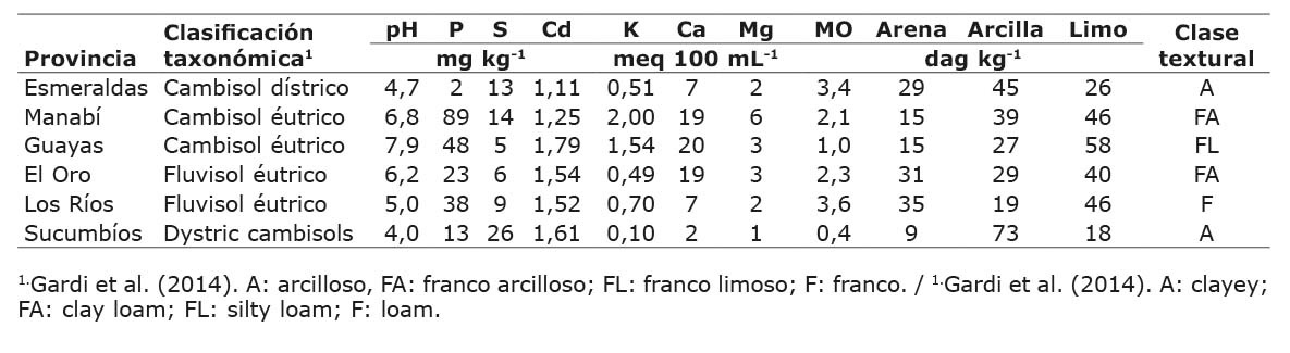 Los suelos para el estudio fueron extraídos de cacaoteras de seis provincias (Esmeraldas, Manabí, Guayas, El Oro, Los Ríos y Sucumbíos), se colectaron de los primeros 0,10 m superficiales de suelo mineral. Para el análisis de textura, se utilizó el método de Boyoucos (Klein, 2008) y para los químicos los utilizados por Quezada-Crespo et al. (2017). La relación utilizada de suelo: agua fue de 1:2,5 para el pH. La materia orgánica se analizó con el método de Walkley-Black (Yarce & Castillo, 2014), P por colorimetría, Cd con agua regia (HNO3 y HCl concentrado, proporción 3:1) modificado por Bacon y Hudson (2001) y usado por Carrillo (2003); el S con fosfato de calcio monobásico, y para S y cationes, se cuantificaron por absorción atómica con la solución extractante de Olsen modificada. Los resultados se observan en el Cuadro 1.
