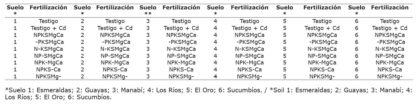 En el desarrollo de la investigación, fueron evaluados los factores suelos (seis suelos tropicales), cada uno sometido a nueve tratamientos de fertilización (testigo absoluto, testigo + Cd, fertilización completa NPKSMgCa y seis de omisión de nutrientes), cuyo arreglo fue el resultado de la combinación de los factores en estudio (Cuadro 2), dando un total de 54 tratamientos, todos instalados con tres repeticiones para un total de 162 unidades experimentales.