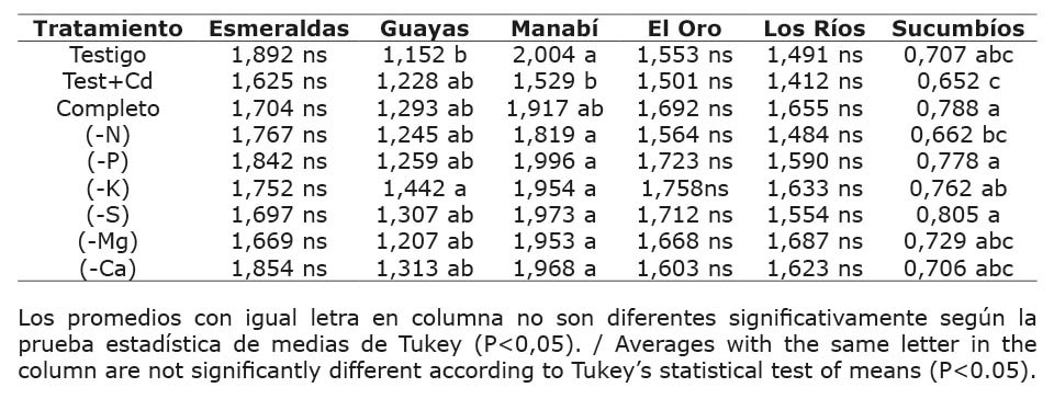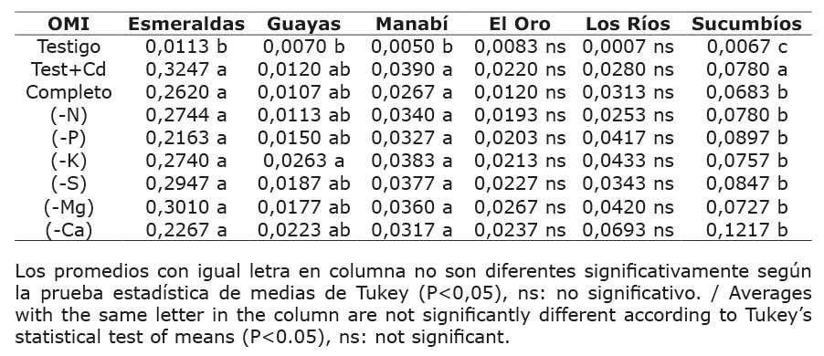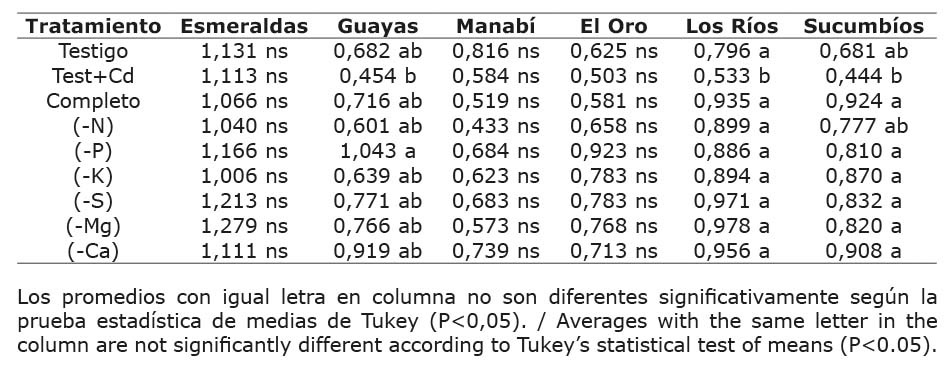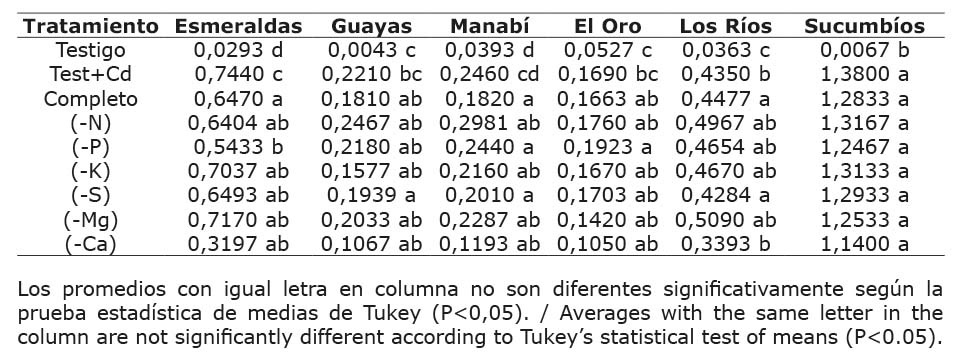El análisis de varianza de la concentración de Cd en la parte aérea de las plántulas de arroz determinó diferencias estadísticas significativas (P<0,05) en los suelos de Esmeraldas, Guayas, Manabí y Sucumbíos por la omisión de nutrientes.