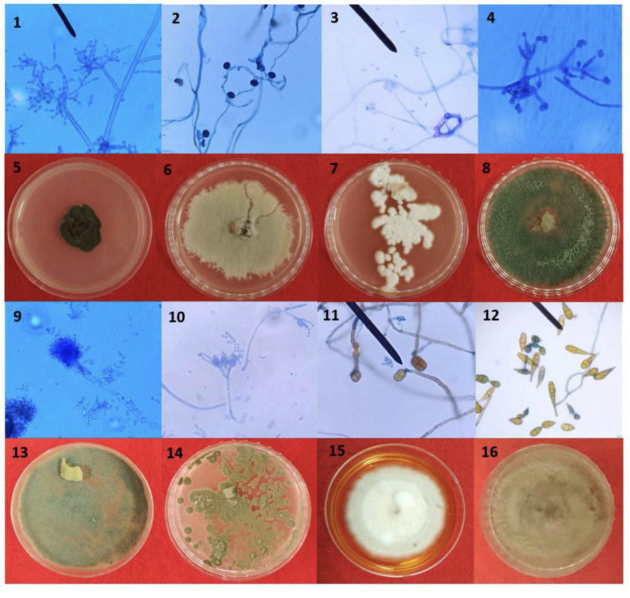 Figure 1. Genera of endophytic fungi identified in Vitis vinifera L. 1, 5. Cladosporium sp. 2, 6 Nigrospora sp. 3, 7 Fusarium sp. 4, 8 Trichoderma sp. 9, 13. Aspergillus sp. 10, 14 Penicillium sp. 11, 15. Stemphylium sp. 12, 16 Alternaria sp. at 100 X. Laboratorio de Sanidad Vegetal, Universidad Nacional de Cañete, Lima, Peru. 2022.