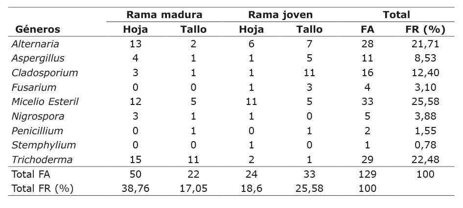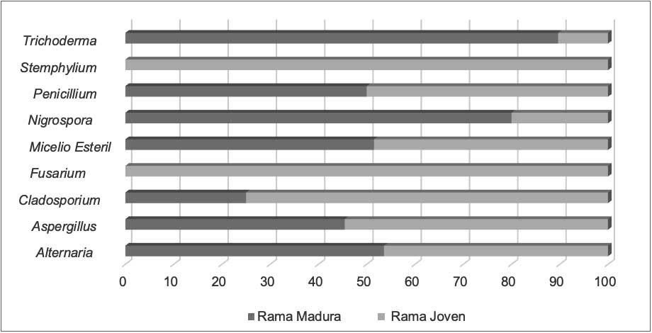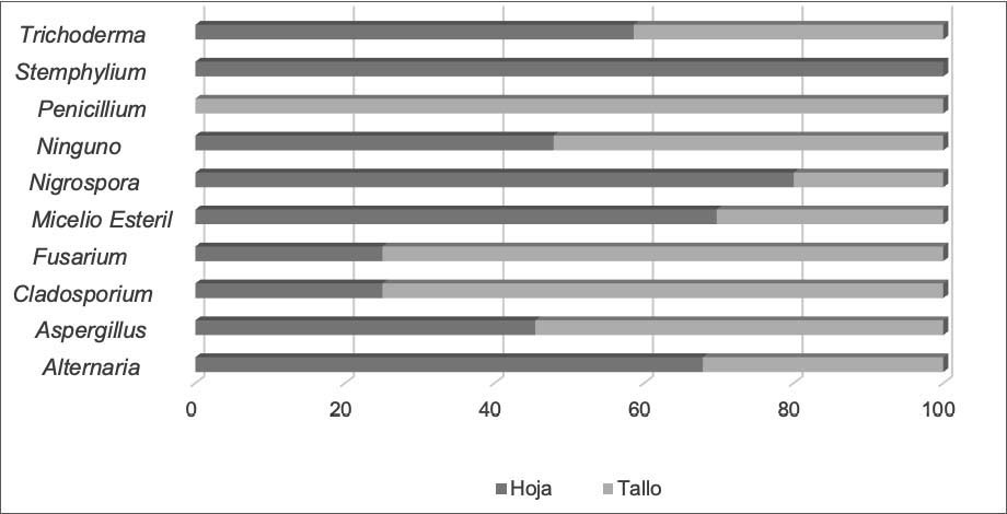 La presencia de los géneros de los hongos endófitos varió según el tipo de órgano de la planta, ambas variables no fueron independientes (p=0,0005) y estuvieron relacionadas con los tipos de ramas (p=0,0009). Es así que, los géneros Trichoderma, Nigrospora y Alternaria, fueron los más frecuentes en ramas maduras, con 89,66 %, 80,00 % y 53,57 %, respectivamente. Mientras que Fusarium y Stemphylium fueron los más frecuentes en ramas jóvenes (100 %), seguido de los géneros Cladosporium y Aspergillus con 75,00 % y 54,55 %, respectivamente. A nivel hojas, la mayor presencia de cepas de hongos endófitos fueron los géneros Stemphylium, Nigrospora, Alternaria y Trichoderma, con valores superiores a 58,62 % en comparación con los géneros Penicillium, Fusarium,Cladosporium y Aspergillus, que fueron los más frecuentes en tallos con valores mayores a 54,55 % (Figura 2 y 3).