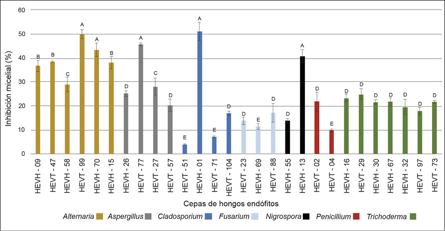 Los metabolitos secundarios de cepas de hongos endófitos de V. vinifera, variaron en su capacidad de inhibir el crecimiento micelial de B. cinerea, con valores de 4,08 a 51,01 %. La cepa HEVH-01 del género Cladosporium fue la que presentó la mayor inhibición micelial de B. cinerea, seguida del género Alternaria (cepas HEVH-99 y HEVT-70), Aspergillus (HEVH-77) y Nigrospora (HEVH-13), con valor mayor al 40,74 % de inhibición, sin diferencias significativas entre dichas cepas. Los metabolitos secundarios extraídos de las cepas HEVT-51 y HEVT-71 del género Cladosporium, mostraron el menor efecto en la inhibición, al igual que las cepas de los géneros Fusarium (HEVH-69) y Penicillium (HEVT-04), con valores menores al 11,44 % de inhibición micelial, sin diferencias significativas entre las cepas (Figura 4). De igual forma, se observó que las cepas de los géneros Fusarium, Penicillium y Trichoderma, presentaron una menor inhibición micelial del patógeno; sin embargo, las cepas HEVT-88, HEVT-02 y HEVT-29 de los géneros mencionados, respectivamente, presentaron una ligera inhibición del crecimiento micelial de B. cinerea en medio PDA, con valores de 17,3, 21,76 y 25, respectivamente, en comparación con el testigo (sin metabolitos) (Figura 5).
