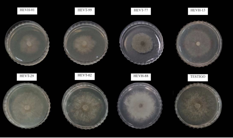 Cepas: HEVH-01 (Cladosporium), HEVH-99 (Alternaria), Aspergillus (HEVH-77), Nigrospora (HEVH-13), Trichoderma (HEVT-29), Penicillium (HEVT-02) y Fusarium (HEVH-88).