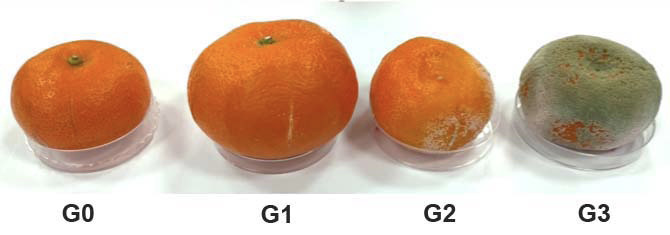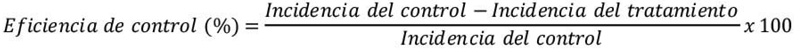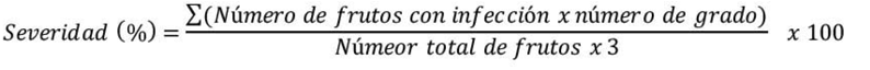 Para medir la incidencia, se evaluaron los síntomas y signos en las heridas de los frutos con relación al total de frutos, el resultado se expresó en porcentaje. Para la severidad se empleó una escala de índice de daño (Cocco et al., 2008) y fue adaptada a una escala gráfica en grados (Figura 1): Grado 0 (sin infección), Grado 1 para alteraciones leves (infección sin esporulación), Grado 2 para alteraciones moderadas (esporulación menor al 50 % del tejido afectado) y Grado 3 para alteraciones severas (esporulación mayor al 50 % del tejido afectado). La incidencia, severidad y eficiencia de control de la enfermedad fue calculado con las ecuaciones 2, 3 y 4, respectivamente (Zhang, He, et al., 2022).