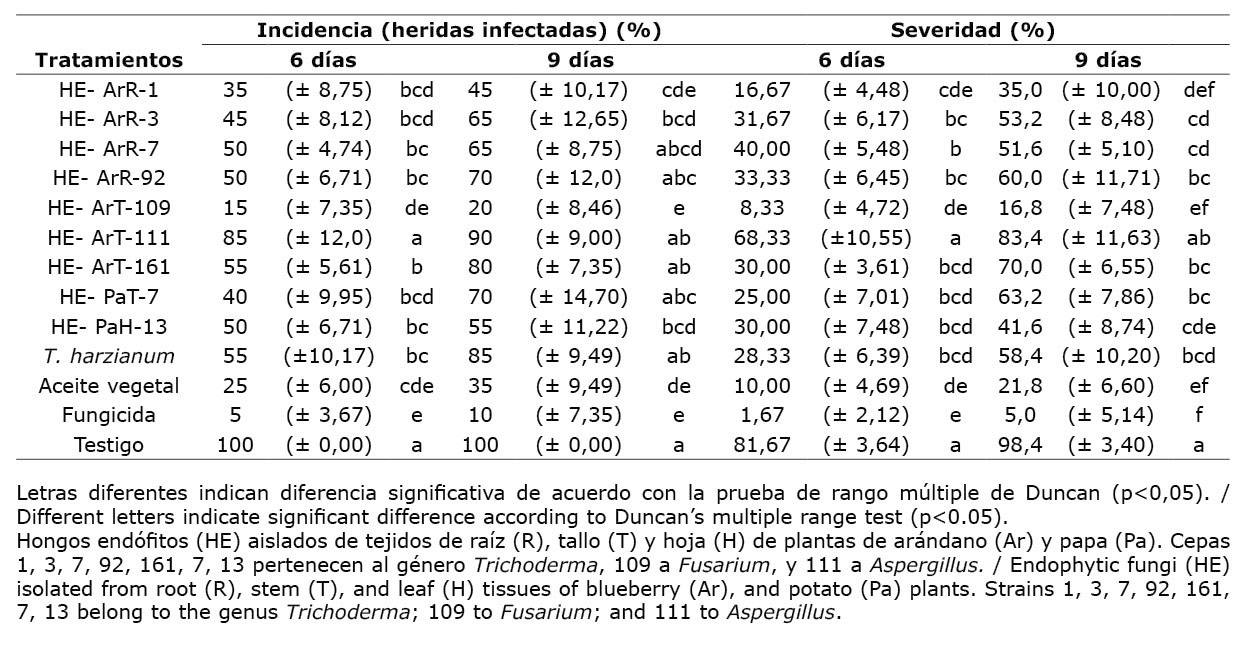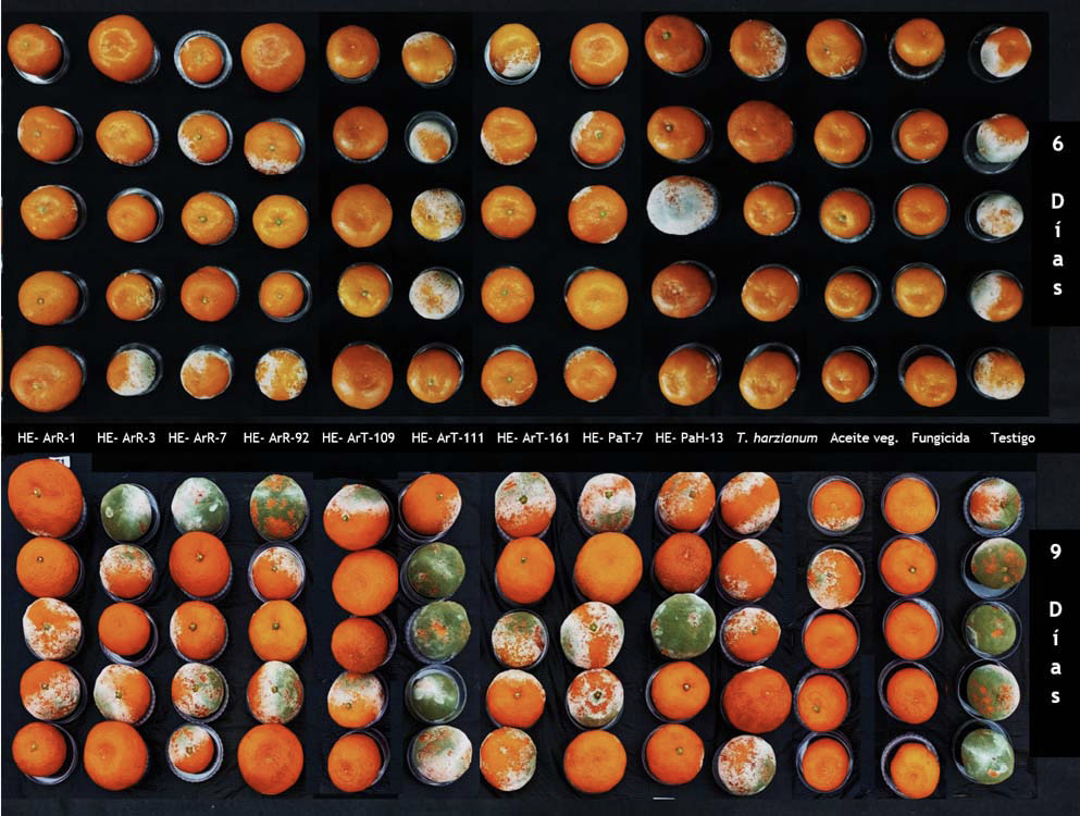 Los metabolitos secundarios de las cepas de hongos endófitos del género Aspergillus (HE-ArT-111) y Fusarium (HE-ArT-109), inhibieron el crecimiento micelial de Penicillium digitatum en un 95,05 y 87,51 %, respetivamente. La cepa HE-ArT-109 redujo el desarrollo del moho verde en frutos de mandarina en un 80 %, a los nueve días de almacenamiento.