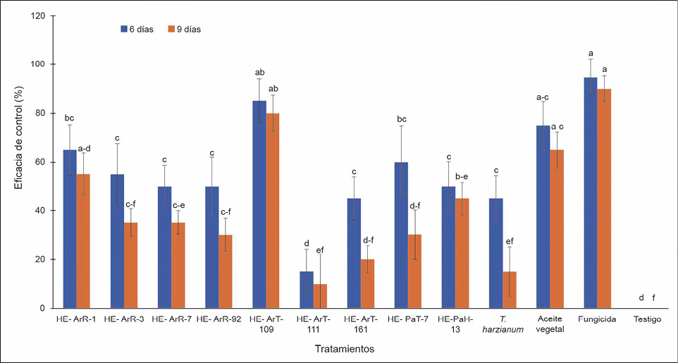 La mayor eficacia de biocontrol de MS se dio a los seis días después de la inoculación con P. digitatum sobre frutos de mandarina, con valores comprendidos desde 15 % hasta 85 %. Sin embargo, a los nueve días de almacenamiento presentaron valores de 10 % a 80 % de eficacia de control. Los frutos tratados con fungicida presentaron la mayor eficacia de control (100 %), seguido de los MS de las cepas HE-ArT-109 y HE-ArR-1 con 80 y 55 %, respectivamente (Figura 5).