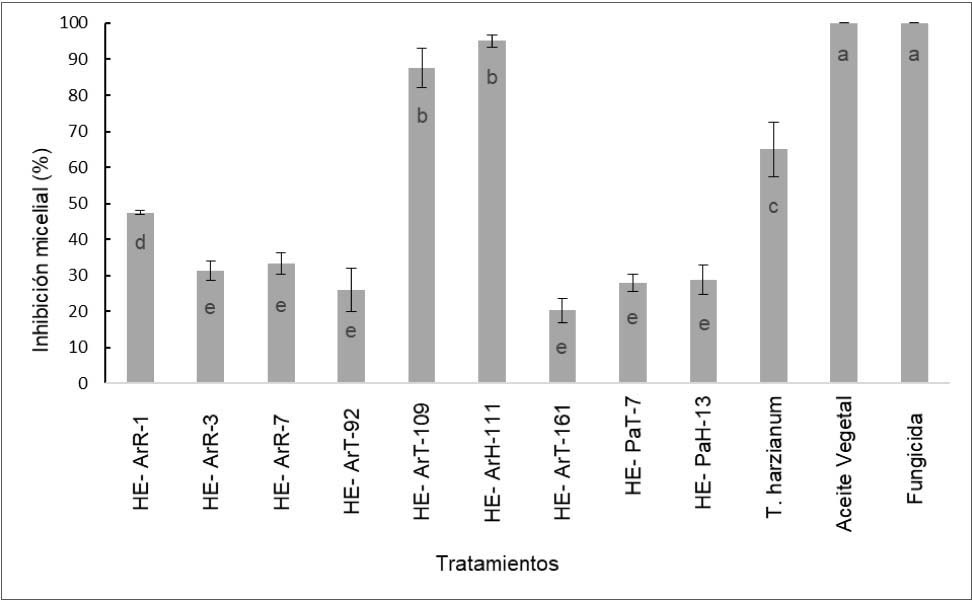 En los ensayos in vitro, los metabolitos secundarios (MS) de diez cepas de hongos endófitos variaron en la inhibición micelial de P. digitatum sobre medio PDA en comparación con el testigo, donde siguió creciendo el patógeno (Figura 2). Los MS de las cepas HE-Art-111 (Aspergillus) y HE-Art-109 (Fusarium), mostraron un efecto potencial de inhibición sobre el crecimiento micelial del patógeno con 95,05 % y 87,51 %, respectivamente, con un comportamiento similar a los tratamientos a base de fungicida y aceite vegetal, los que inhibieron por completo el crecimiento micelial del patógeno. La cepa comercial (T. harzianum) y HE-ArR-1, inhibieron en un 64,98 % y 47,48 %, respectivamente, en comparación con el resto de cepas que tuvieron un menor efecto con valores menores a 33,2 % de inhibición micelial del patógeno (Figura 3).