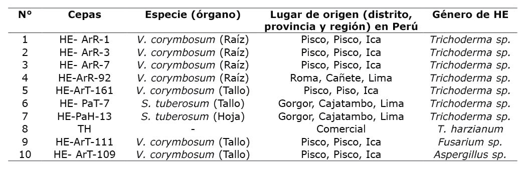 Las cepas de hongos endófitos fueron proporcionadas por el laboratorio de Sanidad Vegetal de la UNDC. Estas fueron aisladas de hojas, tallos y raíz de plantas de arándano (Vaccinium corymbosum) y papa (Solanum tuberosum), de la región de Ica y Lima, Perú (Leon Ttacca et al., 2022), y conservadas en solución de glicerina al 20 %, a una temperatura de -20 °C (Almaraz Sanchez et al., 2019). Para esta investigación se reactivaron diez cepas (Cuadro 1) en placas Petri con medio de cultivo papa dextrosa agar (PDA) y se incubaron a una temperatura de 25 °C por una semana.
