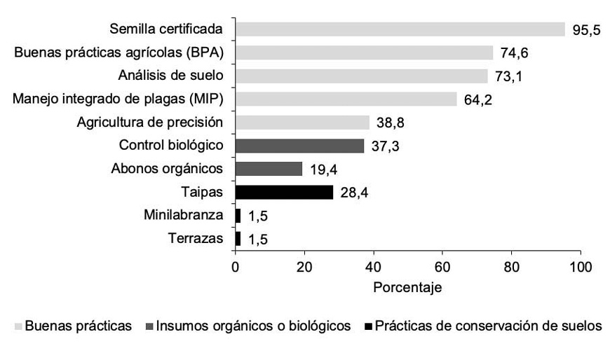 Para la investigación se consideraron un total de diez prácticas sostenibles. Un primer grupo relacionadas al uso de insumos orgánicos o biológicos como la elaboración de abonos orgánicos y la aplicación de controladores biológicos. Un segundo grupo de tecnologías vinculadas a la aplicación de buenas prácticas como el manejo integrado de plagas, el análisis de suelos, uso de semilla certificada, agricultura de precisión y la implementación de otras buenas prácticas agrícolas no indicadas en otros grupos. Por último, un tercer grupo de prácticas relacionadas con la conservación del suelo, tales como uso de terrazas, taipas y mínima labranza.