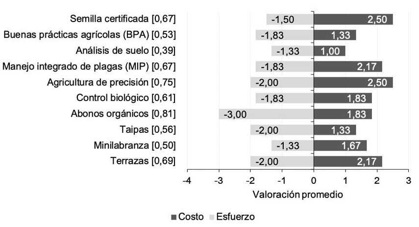 Figure 2. Average evaluation by experts on each conservation practice technology in rice cultivation (Oryza sativa L.), based on cost and implementation effort. Costa Rica, 2021.