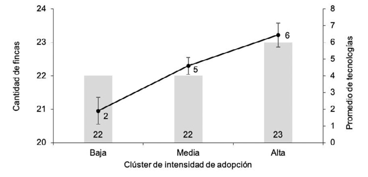 Con el análisis conglomerados, se clasificaron las fincas según su intensidad de adopción en tres grupos (Figura 3). El primero, de baja intensidad, que correspondió a veintidós fincas que en promedio adoptaron dos prácticas sostenibles (EE = 0,17), en promedio son las fincas más pequeñas, de menor rendimiento y productividad, además, son las que menor cantidad de variedades de arroz cultivan (tienden a usar solo una). También son el grupo de personas menos satisfechas con la actividad, pero las que califican mejor la asistencia técnica y las capacitaciones que reciben.